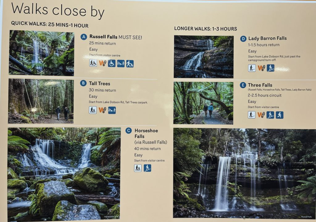 私はA(Russell Falls)とC(Horseshoe Falls)の滝を見てきました。Dも行ければ良かったのですが、日が落ちる前にバイクを走らせてホテル辿り着かないといけないことを考えると、あまり長居が出来ず、断念。
