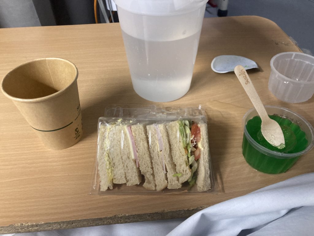 病室に着いてから、とりあえずこれでも食べて、と緑色のライムゼリーとサンドイッチと、りんごジュースを渡されました。